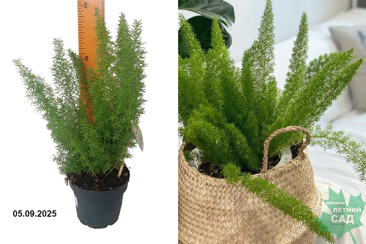 Декоративный горшечный кустарник с множеством пушистых ярко-зелёных побегов, образующих пышную ажурную крону. Прямые стебли, покрытые мелкими травянистыми иголочками-кладодиями, прогибаются под собственным весом. Максимальная высота растения – 60 см. Цветёт редко. Бутоны мелкие, белого или розового цвета.
