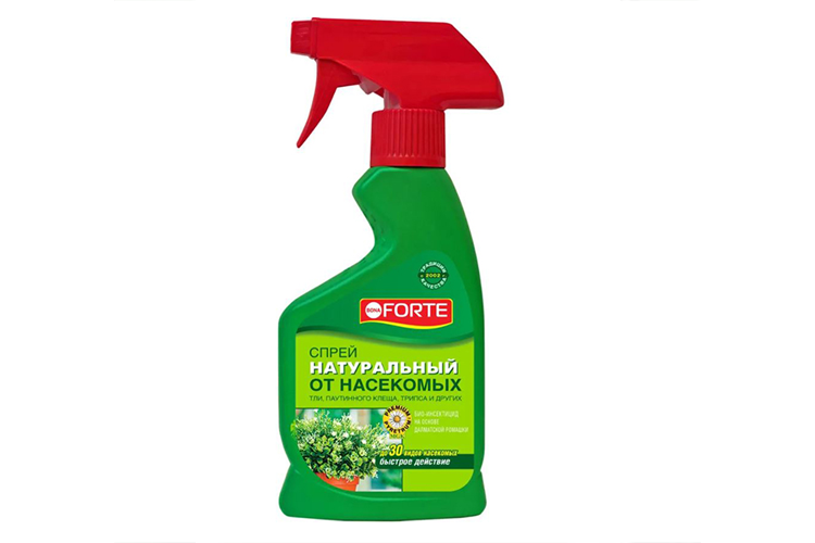 Спрей от насекомых на натуральных пиретринах, не вызывает привыкания. Инсектицид, полученный из цветков далматской ромашки. Предназначен для уничтожения летающих и ползающих насекомых: белокрылки, грибных комариков-сциарид, различных гусениц, долгоносиков, многих видов жуков и клещей, листоблошки, листовертки, минирующих мушек, молей, мух,паутинного клеща, пилильщиков, совок, тли, трипсов, червецов и щитовок.