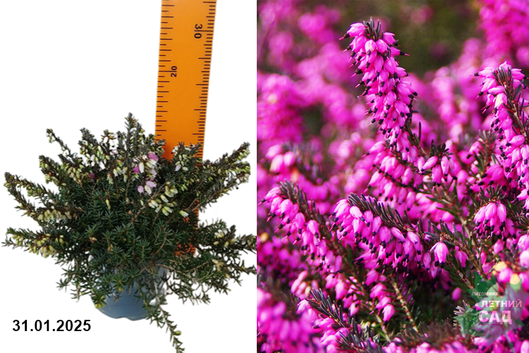 Вечнозеленый, обильноцветущий кустарник. Высота до 20 см, диаметром до 50 см. Листья игольчатые, темно- зеленый. Соцветия мелкие, розвые, колокольчатые, поникающие, собраны в небольшие кисти. Цветет с конца января до позней весны. Практически не обладает ароматом.