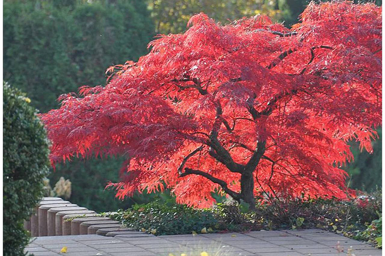 Крупный кустарник или небольшое живописное деревце с зонтичной кроной. Достигает 3-4 м высотой и 2-3 м шириной. Листья 5-9 пальчато- лопастные. Весной и в начале лета ярко-красные, позже темно-красные. Цветы появляются после образования листьев в июне. Плоды изначально красные, очень декоративные.