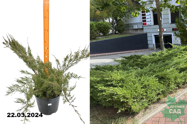 Раскидистый вечнозеленый кустарник с дуговидно-изогнутыми ветвями и свисающими концами побегов. Данный сорт способен разрастаться до высоты 2 м, в диаметре - до 3,5 м. Крупные шишкоягоды 1,2-1,5 см синевато-сизого цвета. Растет довольно быстро. Хвоя чешуйчатая ярко-зеленого цвета. Предпочитает солнечные места. Растет на всех сухих и свежих, умеренно богатых питательными веществами субстратах, от кислых до щелочных. Устойчив к городским условиям. Используется для групповых посадок, подбивки более высокорослых кустарников, для посадки в каменистых садах.