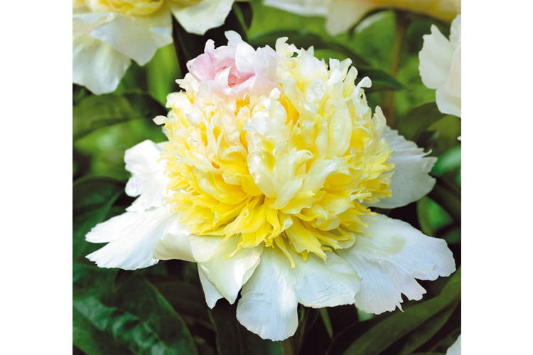 Махровый. Цветок необычной формы, диаметром 18 см, переливчатый – наружные лепестки розоватые, затем корона из ярко-жёлтых коротких петалодий, центр – кремово-розовый.