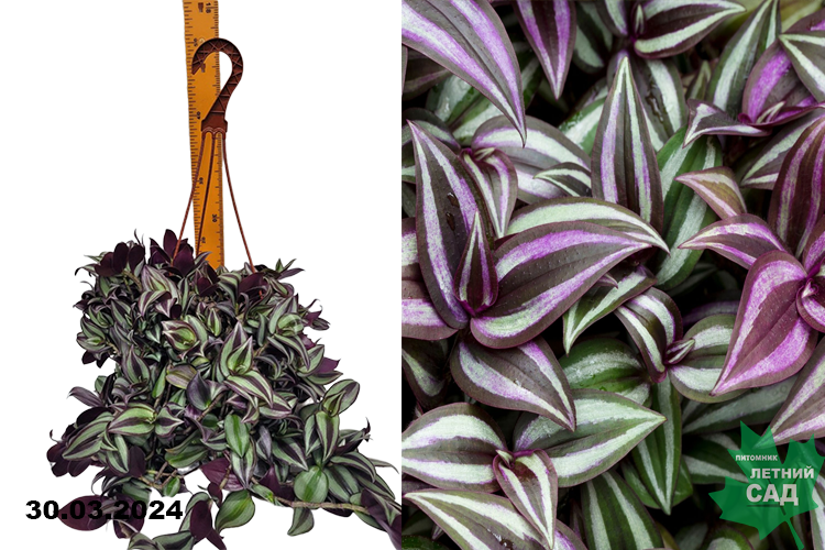 Многолетняя ампельная традесканция с гибкими побегами. Листья заостренные, вытянуто-яйцевидные, сидячие, длиной до 11 см при ширине 6 см (обычно – меньше). Окраска пластин сверху зеленая с двумя серебристыми продольными полосками, снизу – чернильная. Мелкие фиолетовые цветки распускаются весной-осенью.