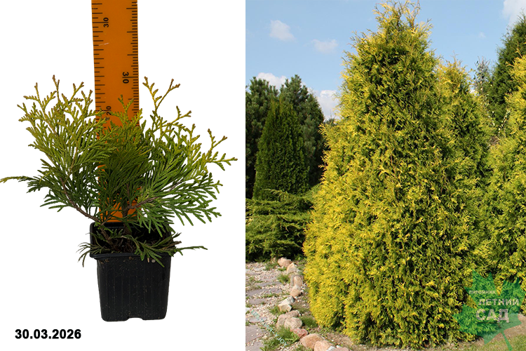 Дерево небольшого размера, имеет коническую крону. Растет относительно медленно, достигает высоты 2 м к 15-ти годам. Диаметр составляет 0,8 м. Особенностью сорта является цвет молодых побегов. Они ярко-желтого, иногда оранжевого цвета. Позже цвет меняется на светло-зеленый, а при подготовке к зиме приобретает бронзовый оттенок. Используется в групповых посадках, для создания аллей, стриженых и свободнорастущих изгородей, хвойных, древесно-кустарниковых и смешанных с многолетниками групп.