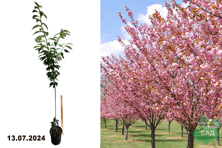 Популярный сорт сакуры. Листопадное быстрорастущее дерево. Ветви немного свисающие, основные - прочные, направлены вверх. Форма кроны в молодом возрасте – перевернутый конус, с возрастом становится более широкой. Кора в молодом возрасте красновато-коричневого цвета, в более зрелом – коричнево-серая, трещиноватая. Корневая система поверхностная, хорошо разветвленная, не дающая отпрысков. Листья эллиптические, очередные, до 8-12 см в длину, глянцевые, меняют окраску в течение сезона: весной при распускании – бронзовые, летом – зеленые, осенью становятся оранжево-желтыми. Цвести начинает на 1-2 год после посадки. Цветет обильно, в начале мая, 1-2 недели. Цветки густомахровые (до 30 лепестков), до 6 см в диаметре, розового цвета, собраны в грозди по 2-5 штук, душистые. Плоды – небольшие, размером с горошину, черные ягоды, горьковатого вкуса.
