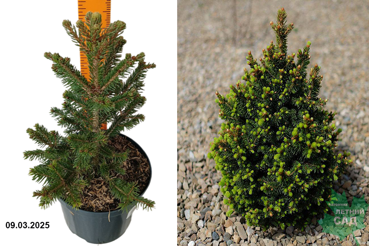 Совсем небольшое деревце, дорастающее лишь до 200 см в высоту при диаметре кроны около 80 см. Растет очень медленно, для достижения указанного размера ели требуется около 10 лет. Сорт имеет прямой крепкий ствол, ветки прочные, растут в стороны с легким уклоном вверх, формируя зеленую пирамиду. Побеги жёсткие, хвоя короткая, тёмно-зелёная. Молодая хвоя имеет светло-зеленый окрас, со временем темнеет до насыщенного зеленого. Иголки четырехгранной формы. Шишки светло-коричневые, конические. Используют в одиночных посадках, группах, аллеях, массивах, живых изгородях.