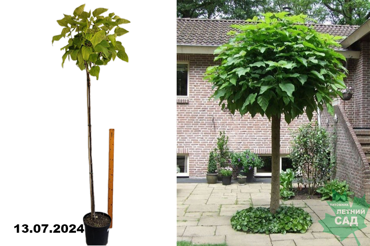 Растение обладает широкой, шаровидной кроной. Листочки располагаются на ветках супротивно, по три штуки на каждой. Длина листьев 10 – 20 сантиметров, окрас – зеленый. Осенью листья становятся светло-зеленого цвета. Зацветает растение в середине лета белыми цветами, с двумя жёлтыми полосками и коричневыми пятнышками. Дерево в течение одного года вырастает на 30 сантиметров вверх. Катальпа любит хорошо освещаемые территории, но может расти и в легкой тени.