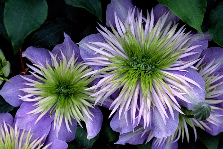 Новый сорт с необычным двойным цветком размером 10-12 см.Это ранний крупноцветковый сорт, сиренево-голубого оттенка с центром, похожим на фонтан. Повторно цветущий сорт: май-июнь и сентябрь-октябрь. Высота 150-180 см.